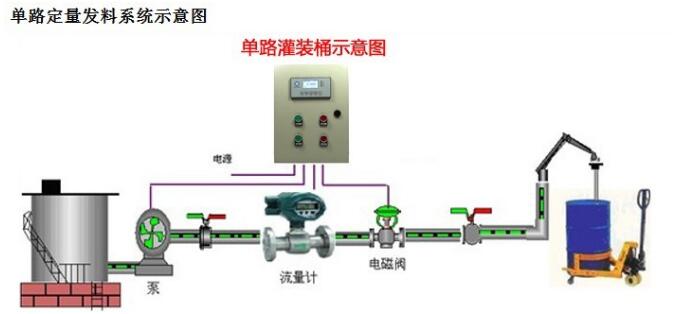 通过流量计提供流量信号给控制仪表,在控制仪表面板上设定定量值,达到设定定量之后,自动关闭电磁阀、水泵等。可同时控制电磁阀、水泵,也可单独控制。
